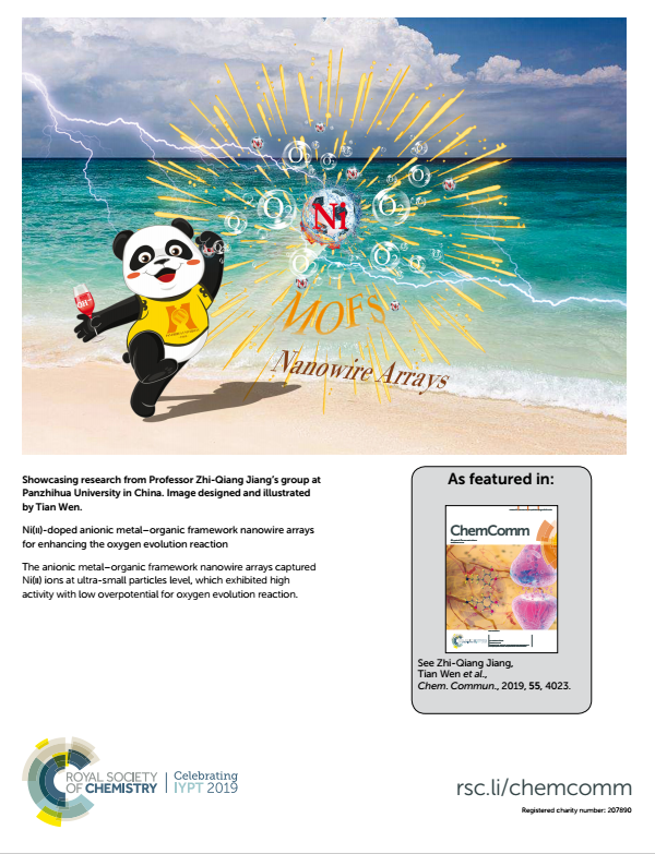 近日获悉,我校生物与化学工程学院蒋志强、李玉峰、朱学军教授团队以蒋志强为第一作者、下载香港宝典2021为第一单位在Royal Society of Chemistry旗下期刊《ChemicalCommunications》(1区,2018IF=6.29)发表了题为《Ni(II)-doped anionic metal-organicframework nanowire arrays for enhancing the oxygen evolution reaction》的研究论文(2019, 55, 4023-4026),这是我校首篇在一区发表的封面论文。