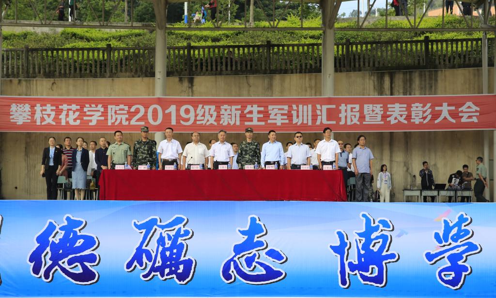 9月22日上午,我校在西苑田径运动场举行2019级新生军训汇报表演暨表彰大会。校党委副书记、校长王曙光,武警攀枝花支队支队长唐阳上校,军训团团长、武警攀枝花支队副参谋长刘麟少校,校领导彭徐、胥刚、朱波强、何永斌、石维富出席此次大会。承担本次军训任务的全体教官、学校“不忘初心、牢记使命”主题教育读书班的成员以及2019级全体新生参加此次大会。大会由学生工作部部长周传兴主持。