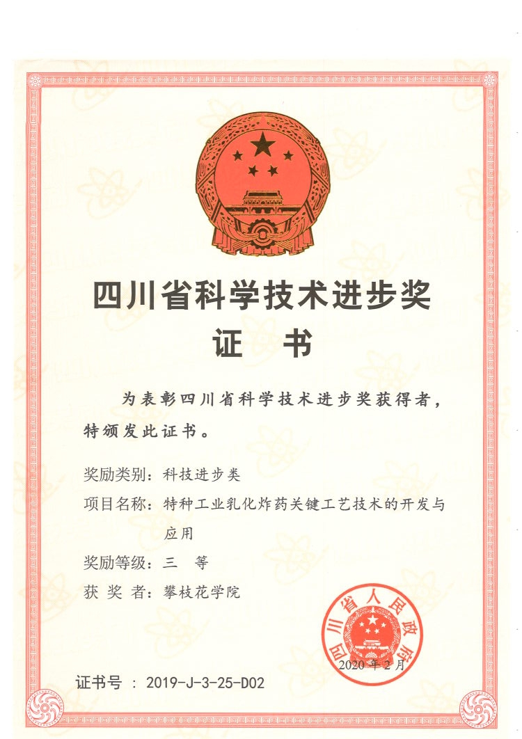 据了解,项目《特种工业乳化炸药关键工艺技术的开发与应用》是学校与攀枝花煤业集团、攀枝花恒威化工有限责任公司共同合作研发项目。项目研发制备的化工产品特种工业炸药,产品质量稳定,大量应用于光面、预裂等特种爆破中。此项目得到了第三方专家组“国际先进”评价,充分体现了我校科研能力的提升。