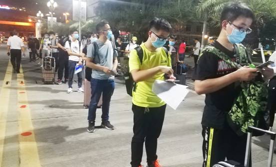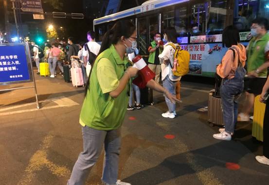 在火车站,志愿者高举接站指示牌,引导返校学生有序乘坐学校的接站专车直达学校。