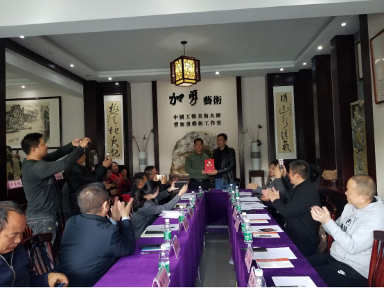 会上,学校和工作室签署了校企合作协议,副校长刘立新为曹加勇颁发雕刻艺术设计专业砚雕工艺工程课程外聘教师聘书。