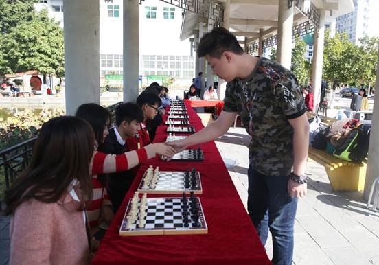 下午,国际象棋冠军选手鲍麒麟、张晟昀、任肖伊与我校国际象棋爱好者在学校静明湖畔进行车轮战对弈,为师生带来了精彩对决。