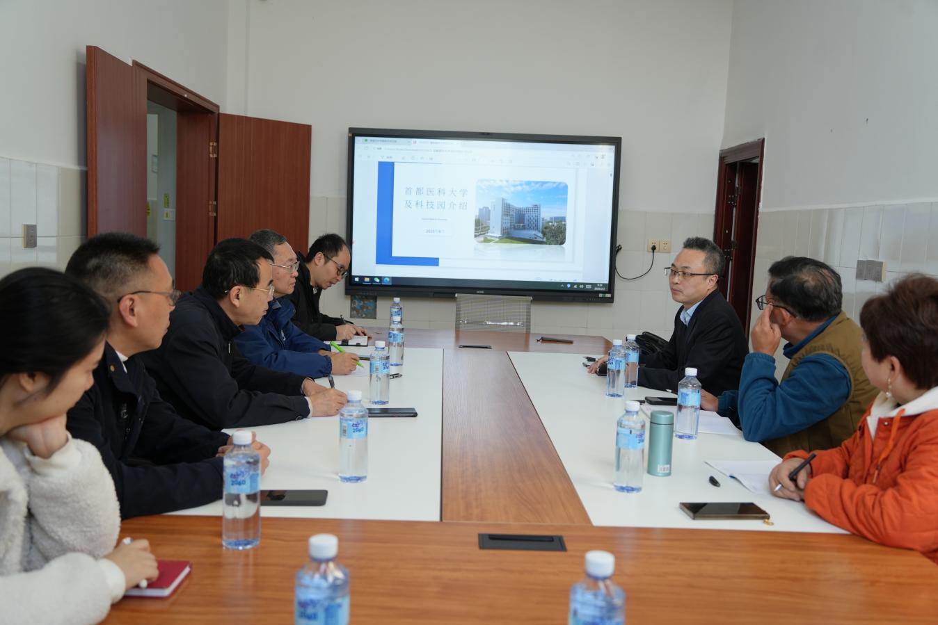基础医学院负责人简要介绍了学校临床医学专业的学科建设历程、科研发展现状、以及在科技成果转化方面所做的工作和取得的成绩。学校脑科学中心主任负责人介绍了中心的科研研究方向与进展情况,并提出了与首都医科大学在心理与精神功能障碍、神经退行性疾病临床成果转化等方面的合作意愿。