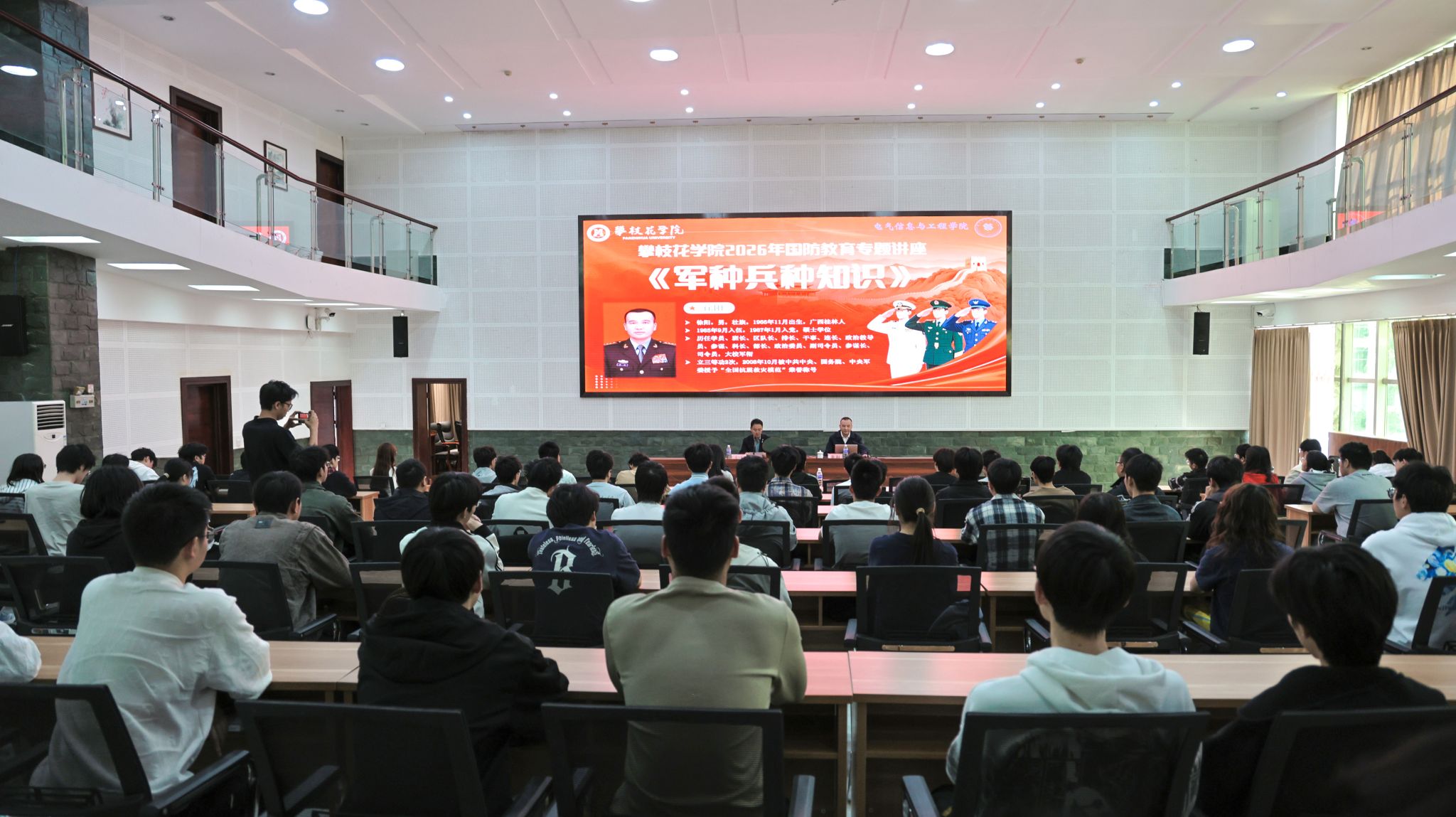 为深入学习贯彻习近平强军思想,落实新时代国防教育要求,增强学生国防观念与忧患意识,3月18日,我校邀请特聘客座教授、原阿坝军分区司令员徐阳开展国防教育专题讲座《军种兵种知识》。武装部相关老师及电气学院130余名师生代表参加活动。