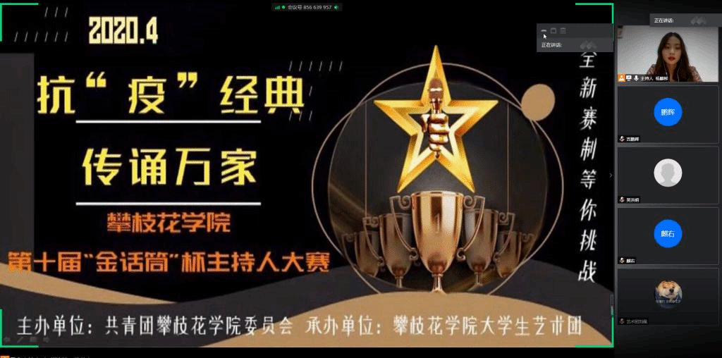 大赛共有十三位选手进入决赛,邀请了校内外五位主持演讲专业老师担任评委,决赛全程通过腾讯会议APP进行线上直播。比赛开始,各位参赛选手通过慷慨激昂的演讲和灵活多变的主持风格,声情并茂、落落大方的展现自己的风采。在选手依次演讲完毕后,各评委老师对比赛进行了详细点评,并对选手的演讲技巧进行了指导。