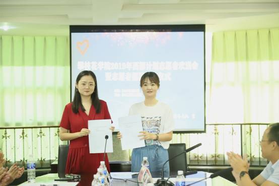 “西部计划”志愿者代表沙志辉、雷倩发言,他们表达了自己的决心与信心,立志将为西部建设贡献出自己的一份力量。各二级学院老师对参加“西部计划”的志愿者们送上祝福,希望他们在以后的工作学习中焕发绚丽光彩。