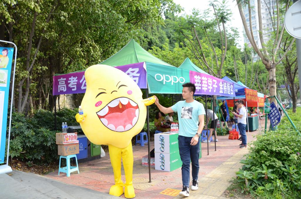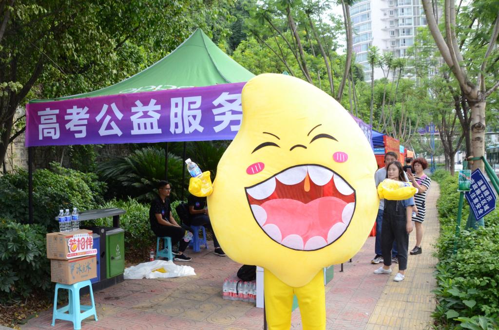 高考期间,“芒果+”小分队成员每天早早地到达攀枝花三中考点,他们冒着酷热穿上芒果公仔服装,充当志愿者形象大使,除参加考试的考生外,不少家长也领到了他们发放的矿泉水。一份甘露一份关怀,小分队成员不断地为步入考场的考生送上矿泉水,并送上“祝你们高考成功”之类的祝福语。接过他们手中的矿泉水,考生、家长们纷纷道谢,并露出欣慰的表情。