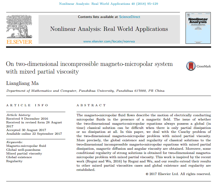 记者今日获悉,以我校为独立单位、数学与计算机学院教师马亮亮为独立作者完成的《On two-dimensional incompressible magneto-micropolar system with mixed partial viscosity》发表于《Nonlinear Analysis: Real World Applications》(影响因子: 2.268;中科学院分区: 1区)。该研究探讨了含有混合部分黏性的二维磁微极流系统的整体正则性。