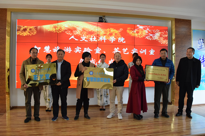 | 校领导为智慧旅游实验室、茶艺实训室、写作实训基地授牌 |