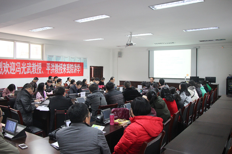 12月24日下午,广东外语外贸大学冯光武教授和平洪教授在我校外语同声传译室举行学术讲座。外语学院党政负责人以及学院部分教师听取了讲座。