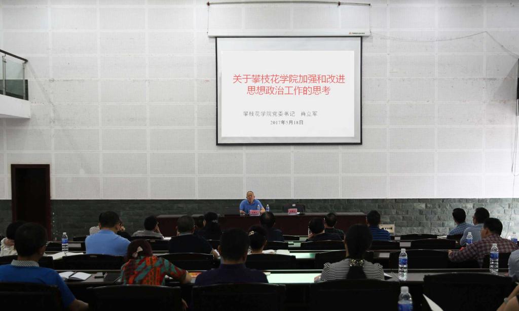 随后,党委书记肖立军传达了全国和四川省高校思想政治工作会议精神,并就加强和改进学校思想政治工作作主题讲话。讲话指出,切实加强和改进我校思想政治工作应从五个大的方面主动思考、作为。一是要加强思想政治理论教育,增强自信。发挥好思政课的主渠道作用,同时在通识教育、心理健康教育和中国特色社会主义理论研究方面做好文章;二是要做好思想政治实践教育,强化社会实践育人。积极发挥校团委、学生会和学生社团联合会的作用,真正做到知行合一;三是要抓住思政教育的第三课堂——思想政治网络教育。发挥好易班工作中心的作用,将思想政治工作与微信、微博、客户端等新媒体技术深度融合;四是要积极探索思政工作全员全过程全方位育人模式,思政教育要覆盖学生发展全过程,促进学生全方位发展,全方位营造教育、管理、服务、实践、文化的育人氛围,让学生不仅在校受益,而且终身受益;五是要强化学校党委的主体责任和二级党组织的领导责任,抓好思政工作的顶层设计,牢牢把握党对高校的领导权,加强教师和思政工作队伍建设,努力构建大思政、大党建格局。