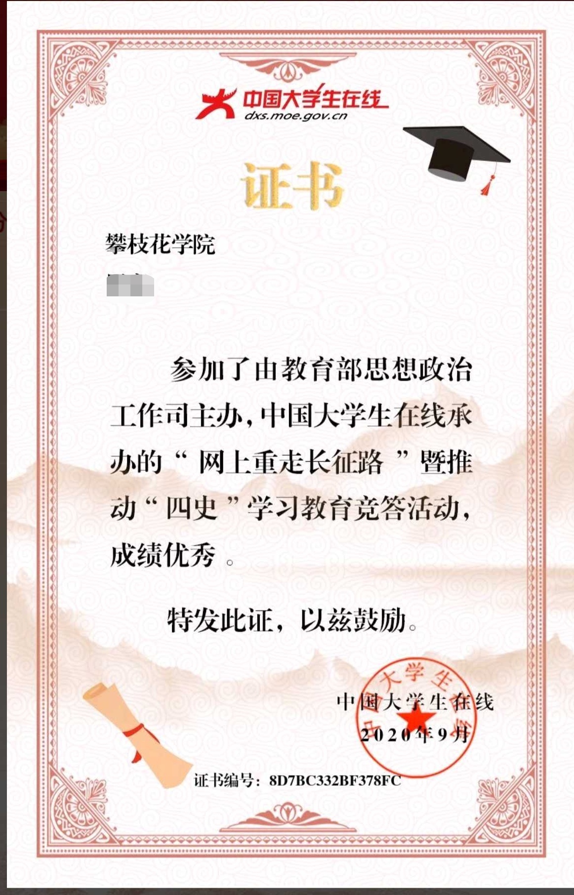 本次四史学习在“中国大学生在线”等多个平台进行,通过答题、竞赛等多种方式对师生学习成果进行检验,个人积分达到100分即获得一个徽章,获得五星徽章后可获得电子证书。我校在四史学习活动中,突出了“英雄”“复兴”“创新”“信念”这四个主题,不断增强“四个自信”,将传承弘扬“长征精神”与努力“走好新时代长征路”相结合,引导广大师生坚定理想信念,厚植爱国情怀,增强斗争精神与斗争能力,发奋成长成才,以实际行动迎接建党一百周年。