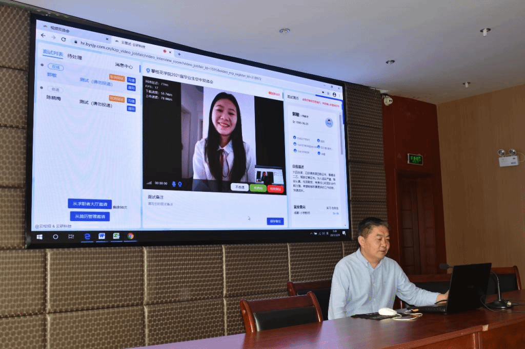 空中双选会举行期间,招就处负责人向王兵副校长介绍了今年毕业生与参会企业的情况,如毕业生所意向工作省份、所意向职业、参会单位所属行业及参会单位性质等。王兵副校长还与毕业生进行了视频交流,向同学们了解就业情况、职业生涯规划等。