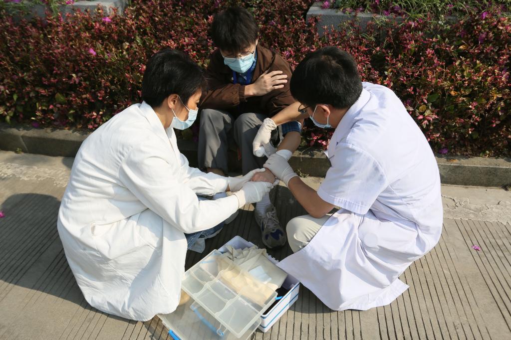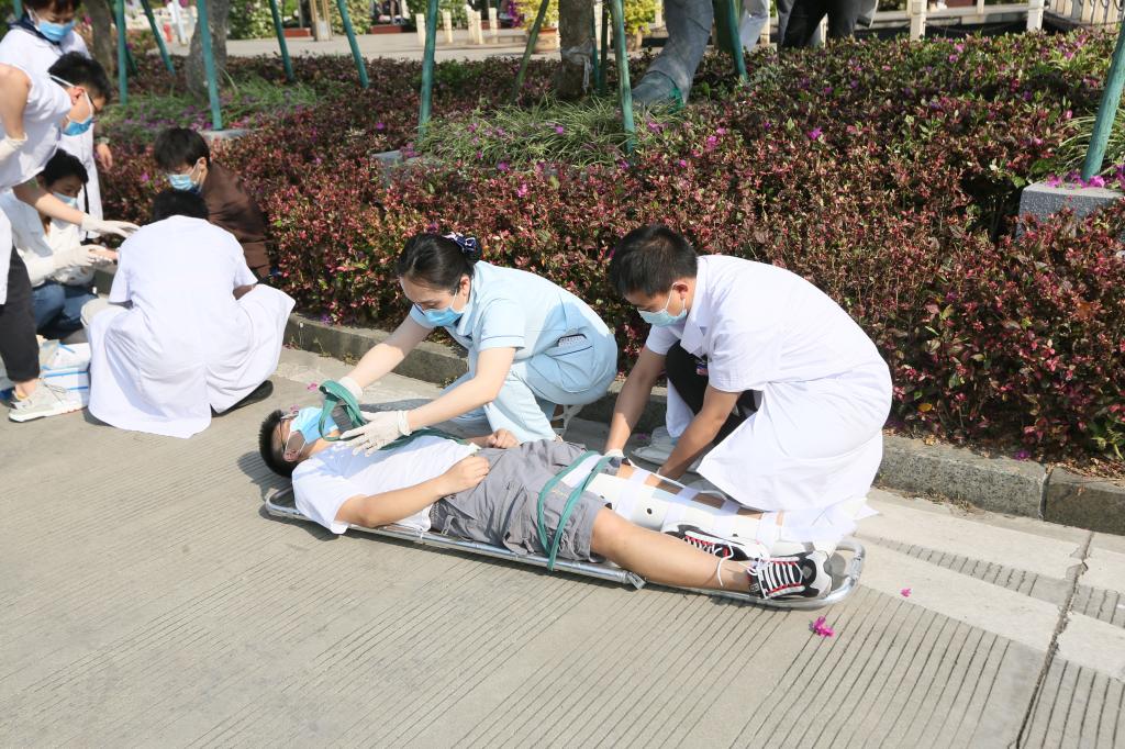 10分钟内,学校学生自救互救队集结完毕,并按照自救预案进行灾情调查和并配合医护人员进行伤员救护。