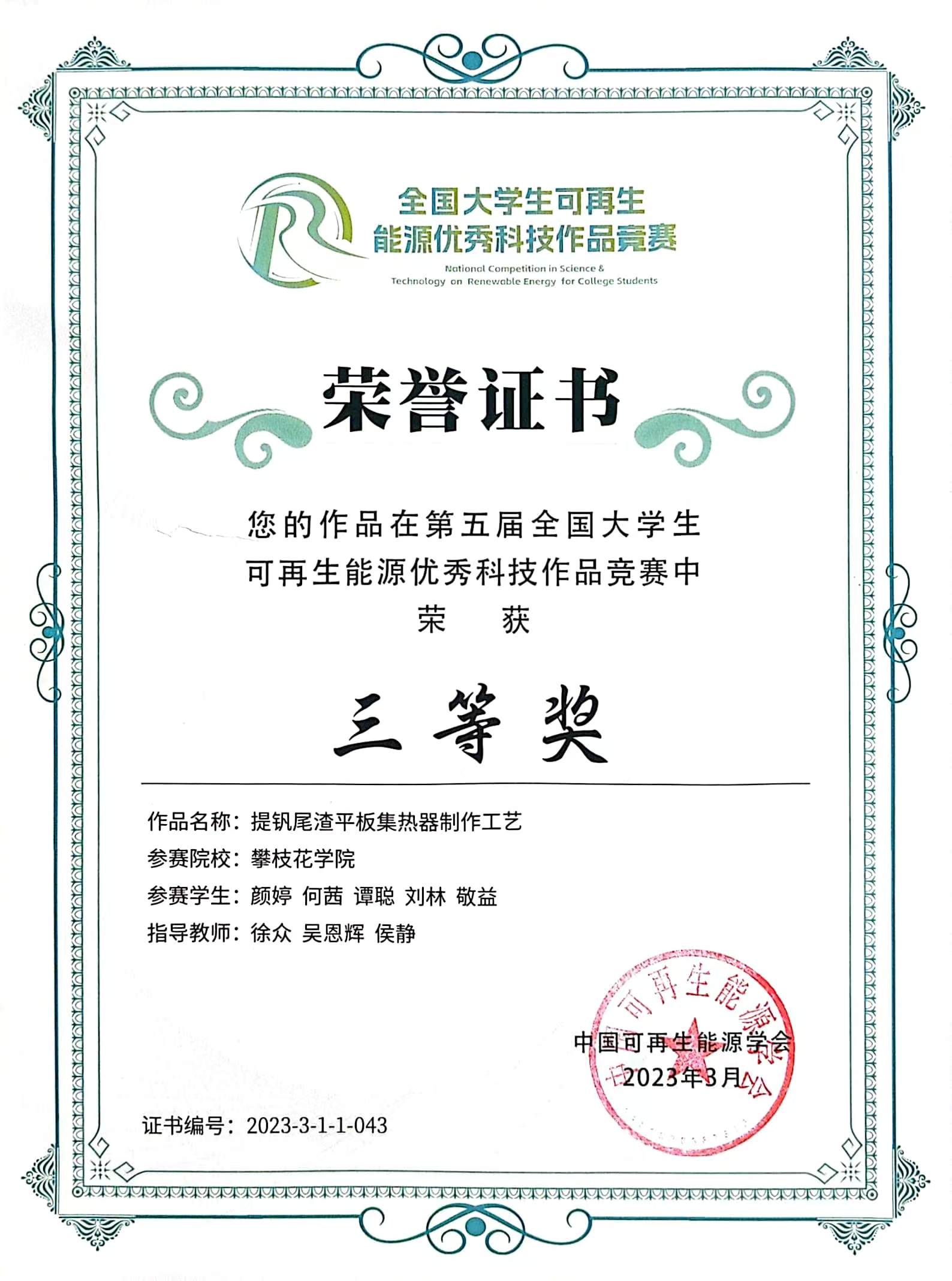 钒钛学院新能源科学与工程专业的颜婷等5名学子在徐众、吴恩辉和侯静等老师指导下,以“提钒尾渣平板集热器制作工艺”项目在第五届全国大学生可再生能源优秀科技作品竞赛中斩获全国三等奖,实现我校在该赛事零的突破。