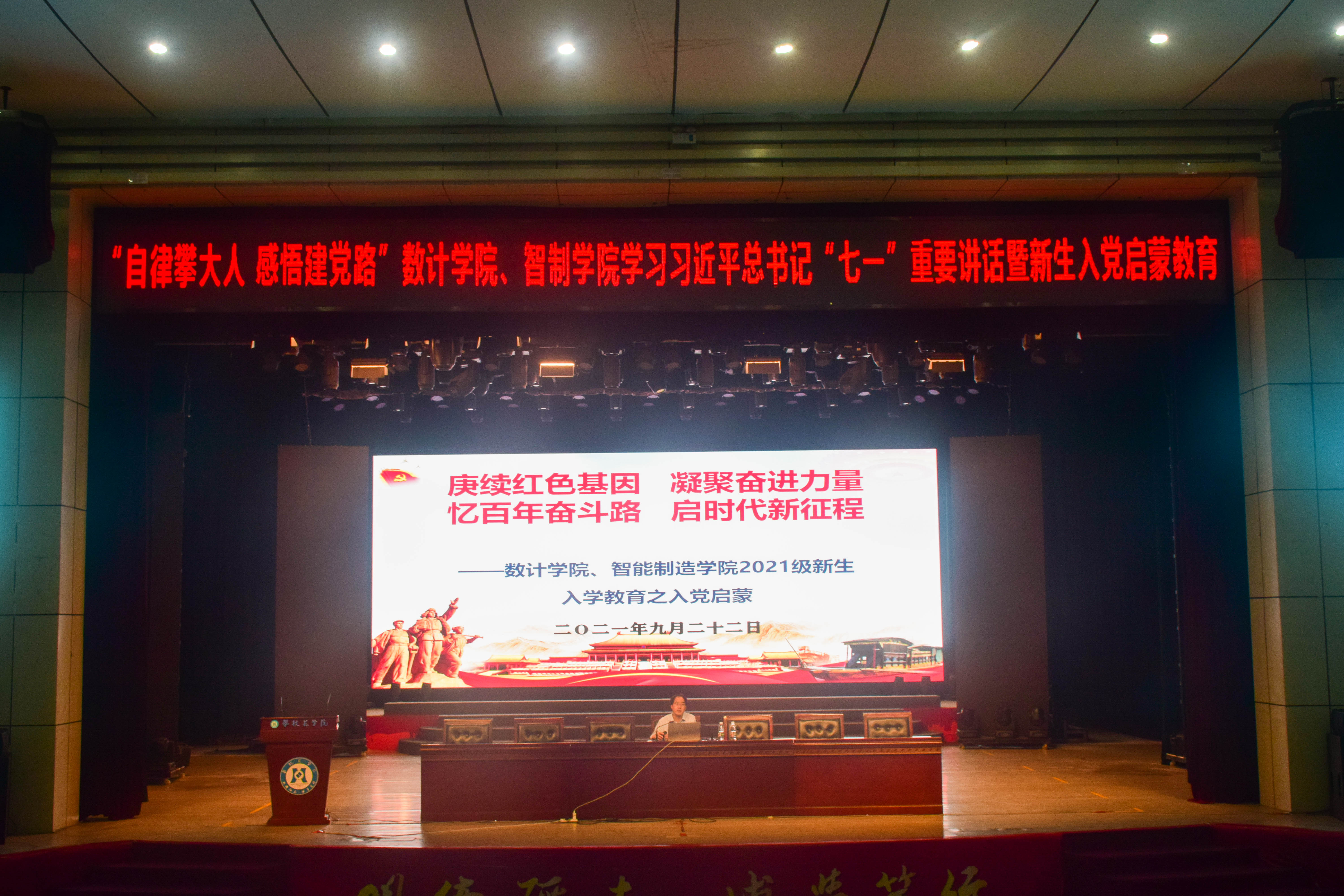 9月22日晚,数计学院与智造学院在会堂共同开展学习习近平总书记“七一”重要讲话暨新生入党启蒙教育活动。