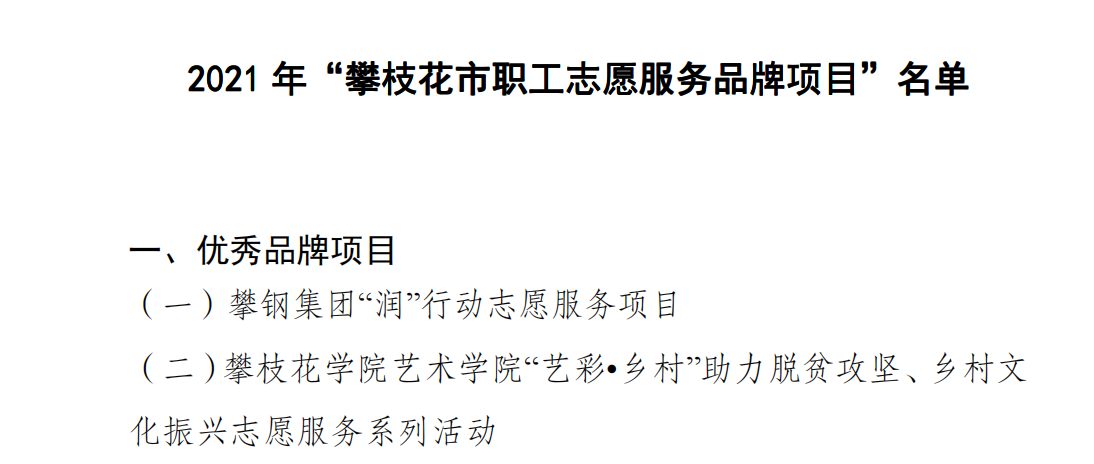 按照《攀枝花市总工会关于开展职工志愿服务活动的通知》要求,经学校工会组织申报,通过市总工会资料审核、严格评审,艺术学院“艺彩•乡村”助力脱贫攻坚、乡村文化振兴志愿服务系列活动成功入选2021年“攀枝花市职工志愿服务品牌项目”,被评为优秀品牌项目。此次全市仅有两个项目入选优秀品牌项目。