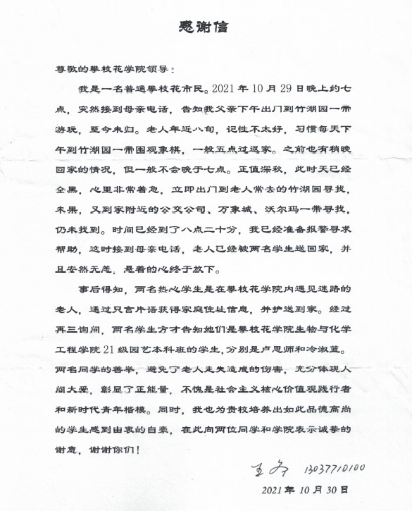 近日,学校收到市民王某的一封感谢信,对生化学院(农学院)2021级园艺本科班的学生卢思师和冷淑蓝护送王某八旬父亲回家表示感谢。