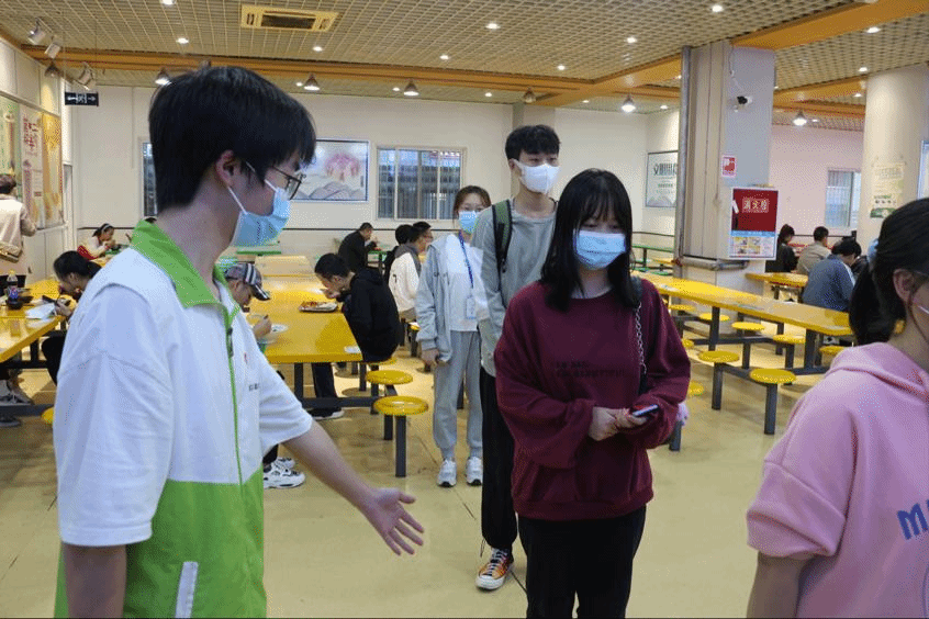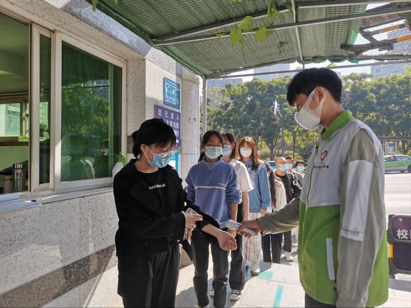 志愿服务队伍分为食堂防疫志愿服务组、公寓防疫志愿服务组、校园快递代收点秩序维护小组、门岗防疫志愿服务组、校园活动管理志愿服务组。南苑和西苑各校门口、食堂、公寓、快递代收点和学生活动中心都能看见志愿者们忙碌的身影:维持排队秩序、监督佩戴口罩、保持一米间距。一件绿马甲、一句温情提示,志愿者们督促大家遵守疫情防控要求,做到不聚集不扎堆,主动担当,守护师生健康。