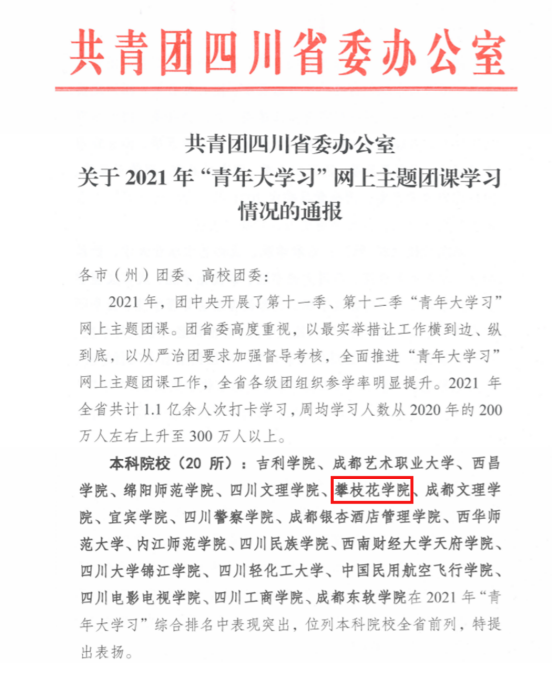 1月4日,在团省委“关于2021年‘青年大学习’网上主题团课学习情况的通报”文件中,我校团组织以全省本科院校第六名的优异成绩被团省委通报表扬。