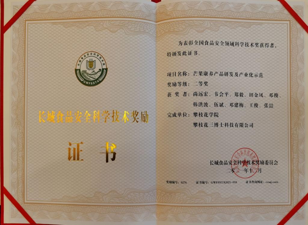 1月13日-14日,由中国食品报社、长城食品安全科学技术奖励委员会、中国食品药品企业质量安全促进会、北京食品学会主办的“第四届长城食品安全科学技术奖颁奖大会和第五届食安中国发展高峰论坛暨食品安全科技创新院士论坛”在昆明举行。学校申报的《芒果康养产品研发及产业化示范》项目荣获2021年长城食品安全科学技术二等奖。2021年长城食品安全科学技术奖设奖项24个,四川省仅有我校申报项目1项获奖。