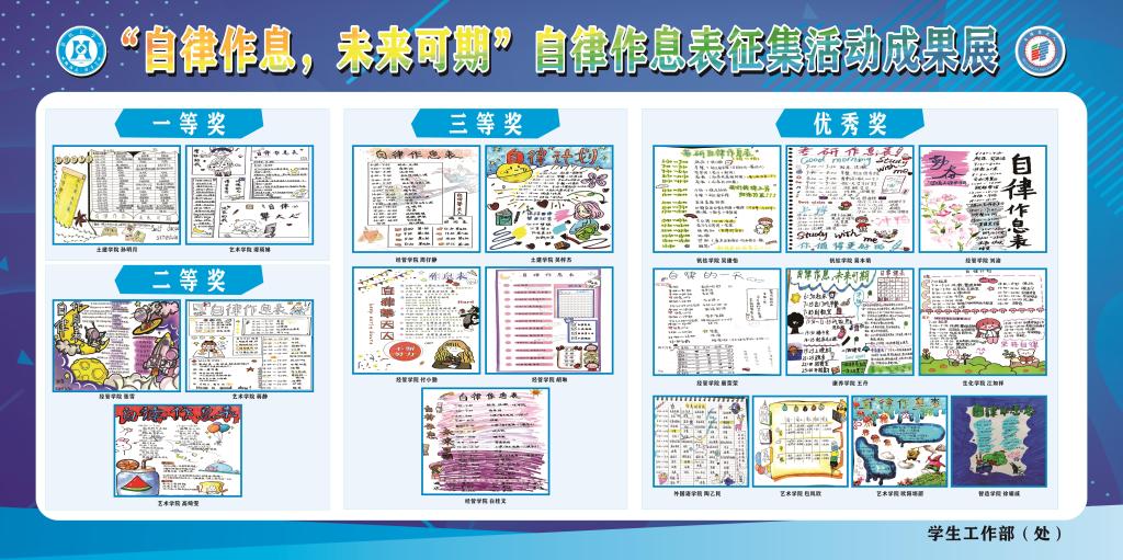活动以线上宣传和线下摆点为载体,以心愿墙和有奖征集作息表的方式鼓励全校学生积极参与。经学工部老师代表、学生代表共同评选,活动共初选入围作品65份,共产生20份优秀作品,评选出一等奖2名,二等奖3名,三等奖5名。学工部将对优秀作息表进行奖励并通过“攀大自律学工”微信公众号和线下平台进行集中展示。