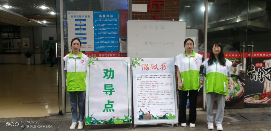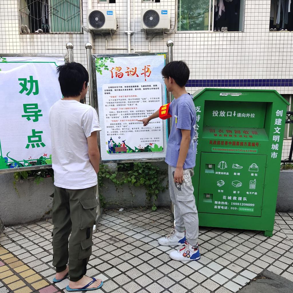 学工部、团委、各二级学院老师和学生骨干组成劝导队伍,佩戴“自律督查”标识,在教学楼、实验楼、食堂、公寓出口及部分校园主干道设立劝导点,张贴倡议书,对公共场出现“穿拖鞋”等不文明行为进行耐心劝导。