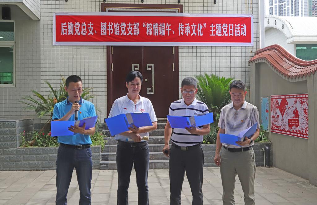 后勤党总支书记肖国玉围绕端午节起源、爱国精神和增强文化自信、提升服务能力给大家上了一堂微党课。随后,党员同志们表演了诗朗诵《离骚(节选)》《忆屈原》《中国话》等,合唱歌曲《我和我的祖国》,并开展了互赠香囊、包粽子、知识竞答等端午文化体验活动。最后,大家到阅览室向同学们分发了新鲜出炉的粽子,将端午文化和美好祝福带给大家。