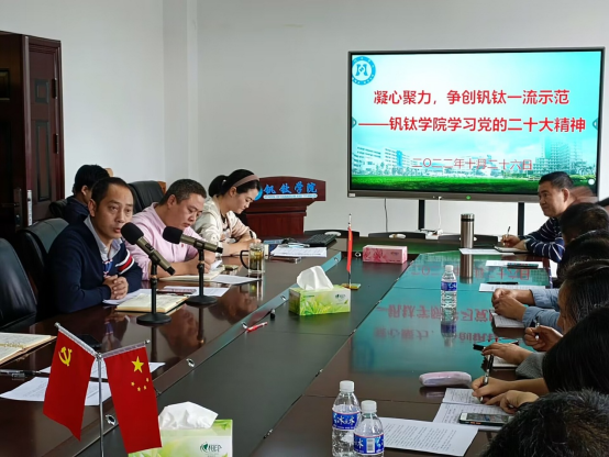 院党委负责人引用党的二十大报告中习近平总书记提出的“三个务必”“十年来的三件大事”“牢牢把握五个重大原则”“五个必由之路”等重要论述为我们领学了党的二十大精神,并强调学习宣传贯彻党的二十大精神是当前和今后一个时期的重要政治任务,从钒钛学院来讲,要迅速地将思想和行动统一到党的二十大精神中,抓住与学院人才培养、学科发展等方面契合的内容,善作善为善成,特别是指出二十大报告中强调的科技创新的重要性,希望钒钛学院能够围绕攀西战略资源创新开发试验区建设,为强化国家战略科技力量作出应有贡献。