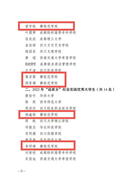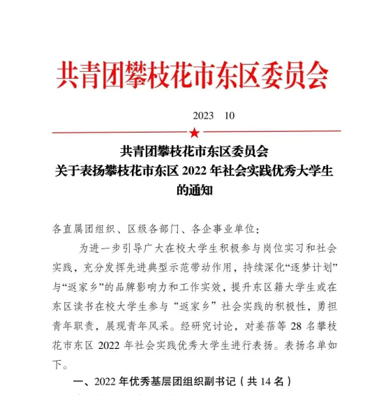 近日,共青团攀枝花市东区委员会发布《关于表扬攀枝花市东区2022年社会实践优秀大学生的通知》 ,我校经济与管理学院2020级国贸专业谌宇航、智能制造学院2020级汽车电子技术专业詹宗霖、经济与管理学院2021级会计学专业胡茗耀三名同学荣获“2022年优秀基层团组织副书记”,经管学院2019级工商管理专业杨鑫铌、智能制造学院2020级车辆工程专业李明婧两名同学荣获“2022 年‘返家乡’社会实践优秀大学生”。其中,4名同学为我校团学干部骨干,2名同学为我校“青马工程”班学员。
