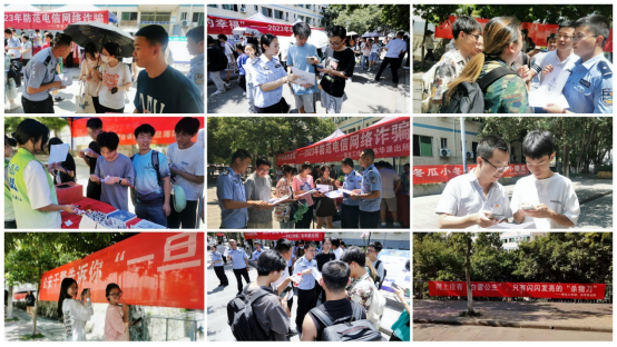 在学生生活区邀请公安干警布点宣传,通过发放宣传图册、播放典型案例视频、开展反诈知识问答、反诈签名、悬挂横幅等多种形式开展线下防诈反诈教育宣传。