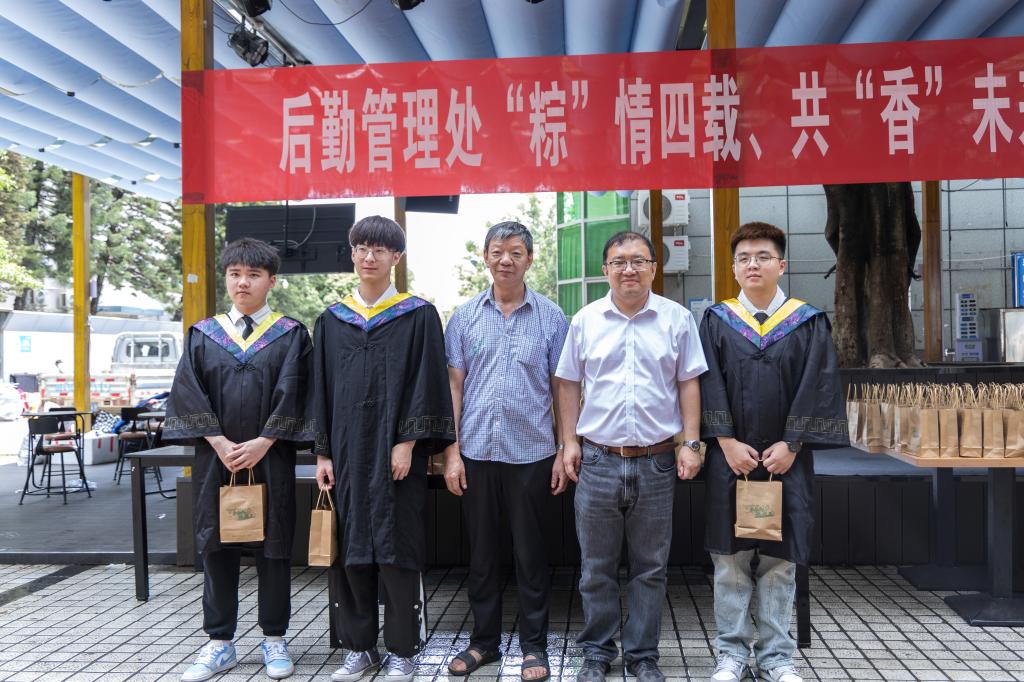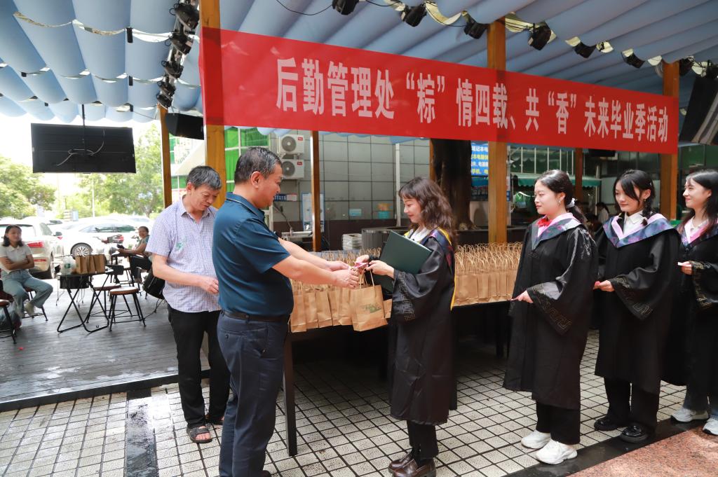 栀子花开时,扬帆启航季。我校后勤管理处举办了“粽情四载、共香未来”的毕业季赠礼活动。本次活动食堂共计送出端午礼粽8000余个,送出鸡腿2500余份。后勤管理处党总支书记、后勤管理处负责人、学生工作处负责人参与了赠礼发放。