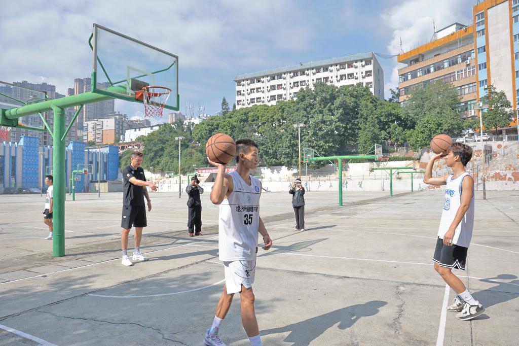 9月18日上午在学校篮球场,四川金强男子篮球队在莫科总教练带领下荐临我校,对我校篮球队进行指导交流。