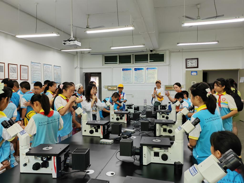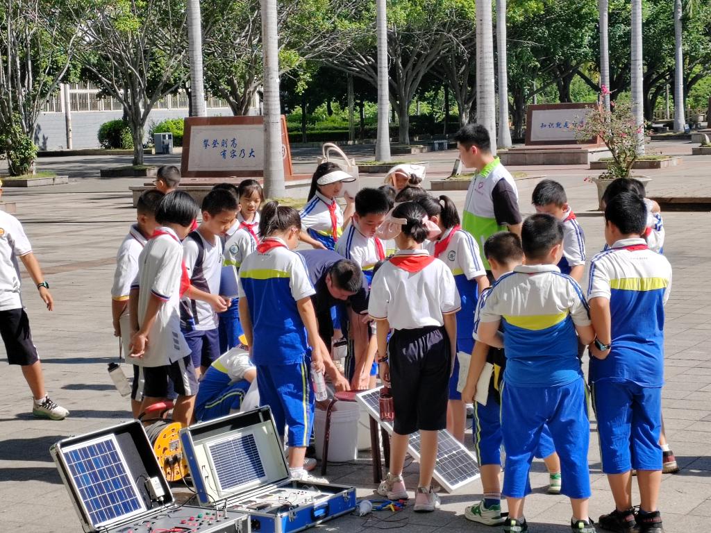 李俊翰为同学们讲解攀枝花钒钛资源开发史及综合利用现状、钒钛材料中试基地的功能。钒钛文化普及基地科普志愿服务队向中小学生们介绍钒钛的发现、功能性质及应用领域。钒钛学院金相大赛国家金奖队成员带领学生们参观金相实验室,介绍什么是金相、为什么要做金相、如何制备高品质金相,并指导学生们利用金相显微镜观察钒钛产品的金相显微组织。徐众为同学们现场演示了利用太阳能光伏发电提水实验。