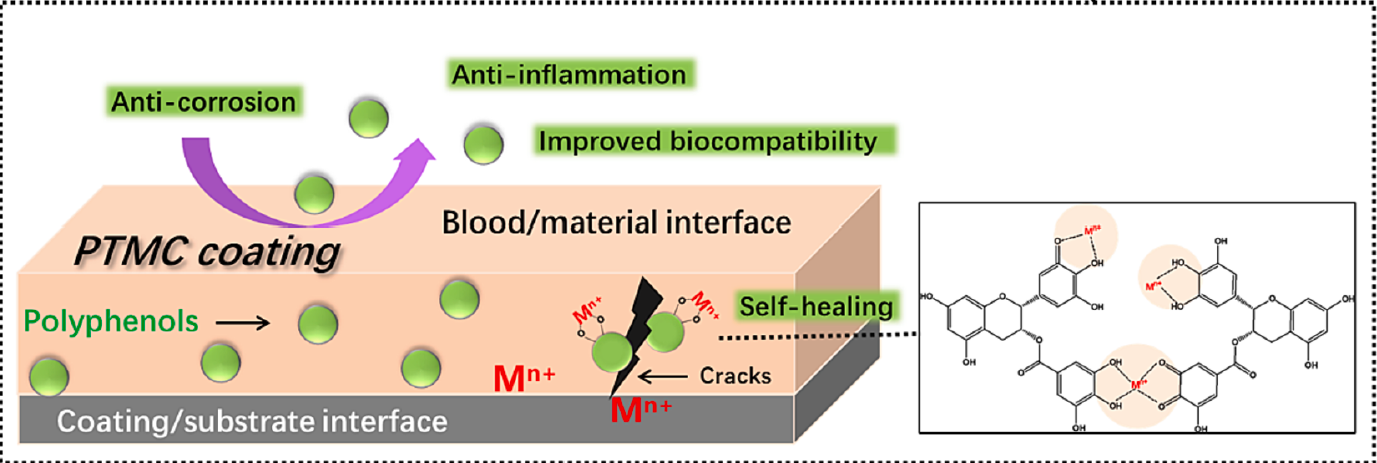 可降解镁基血管支架已成为介入领域的研究热点,但存在降解速率过快和生物功能性不足等问题。本研究开发了一种适用于镁基血管支架表面改性的自修复涂层。利用多酚可以和金属离子形成稳定的络合物的性能,将其作为腐蚀抑制剂添加到可降解聚合物涂层中,实现涂层的自我修复和长期耐腐蚀稳定性。同时,多酚具有药用价值,可以在支架植入部位释放,起到局部抗炎、抗氧化等作用。研究表明,该涂层具有良好的自修复能力,血液相容性,可选择性地促进内皮细胞生长并抑制平滑肌细胞增殖,且可抑制周围组织的炎症反应。装载多酚的自修复涂层在镁基心血管支架的表面改性方面具有较大的应用潜力。