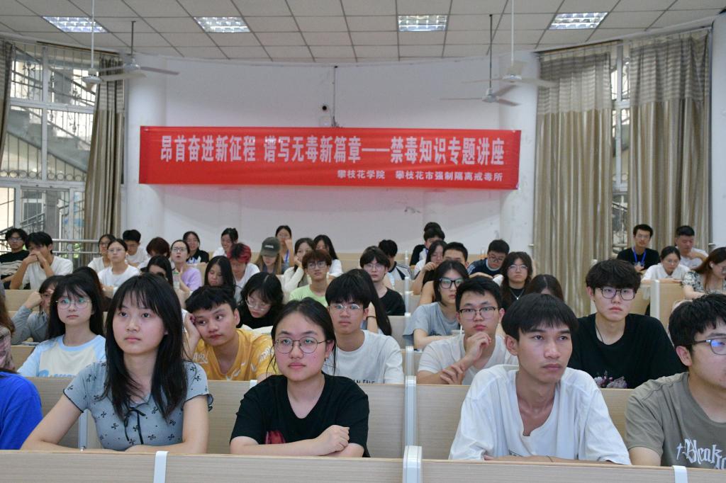 为提高全体师生防毒、拒毒、禁毒的意识,营造良好的校园禁毒氛围,6月11日晚在第二教学楼开展“昂首奋进新征程,谱写无毒新篇章”禁毒知识专题讲座。本次讲座邀请到攀枝花市强制隔离戒毒所一级警长谭耀华进行专题教育宣讲。