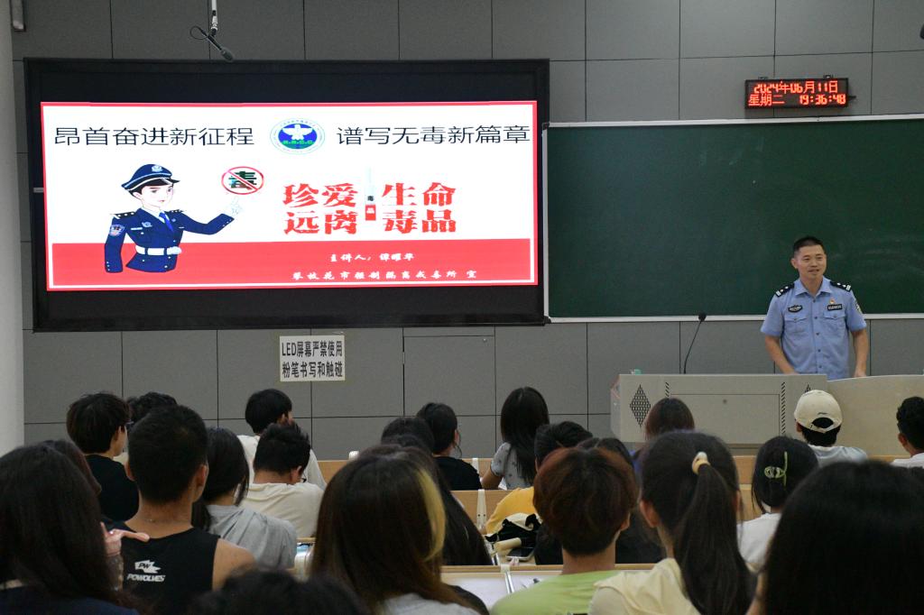 活动伊始,谭耀华围绕“毒品的危害性”、“禁毒法律法规”和“大学生如何防范毒品”三个方面展开讲解,同时结合禁毒工作中鲜活案例,深入浅出地给学生论述和分析了毒品对个人、家庭和社会的危害。以血的教训、铁的事实告诫学生们牢牢掌握禁毒知识,了解禁毒相关法律法规,增强法律意识,树立正确的价值观,培养良好的生活习惯,增强自我保护意识,自觉抵制毒品。
