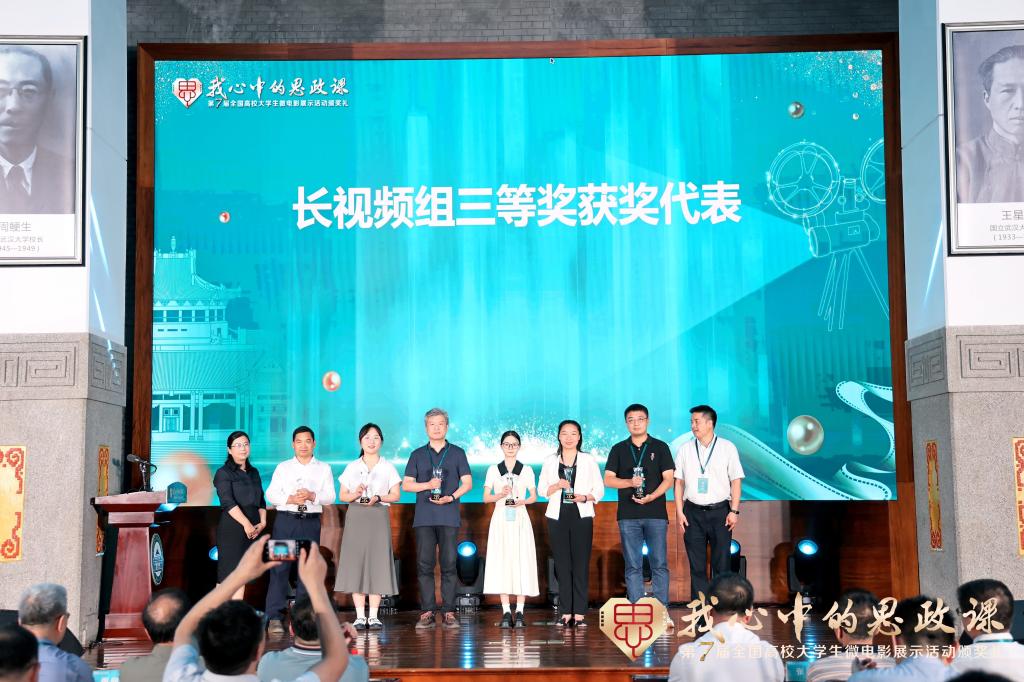 2024年6月14日晚,由教育部社会科学司指导、教育部高校思想政治理论课教学指导委员会主办、武汉大学马克思主义学院承办的第七届“我心中的思政课”全国高校大学生微电影展示活动颁奖典礼在武汉大学樱顶老图书馆隆重举行。马克思主义学院《食全食美》学生创作团队负责人、文学院钟悦受邀参与此次颁奖典礼并代表三等奖获奖团队发表感言。