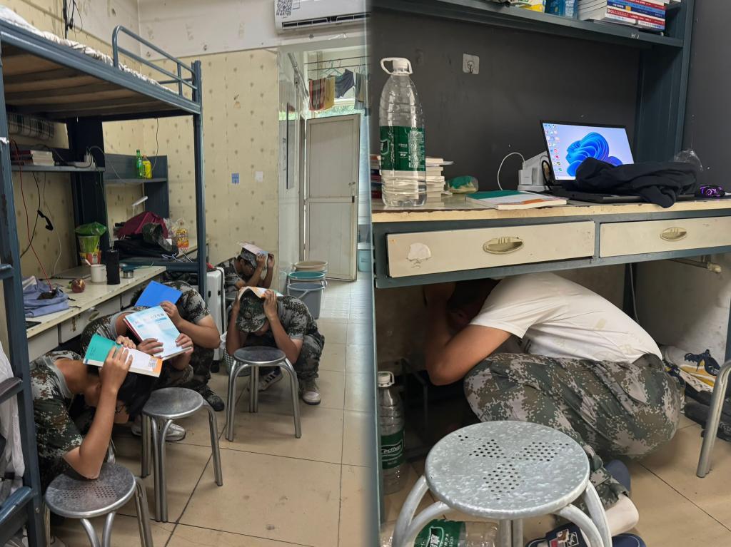 2点30分,随着模拟警报声响起,演练正式开始。第一次地震波到达,学生公寓管理员及学生骨干组织寝室学生就地开展自我防护。