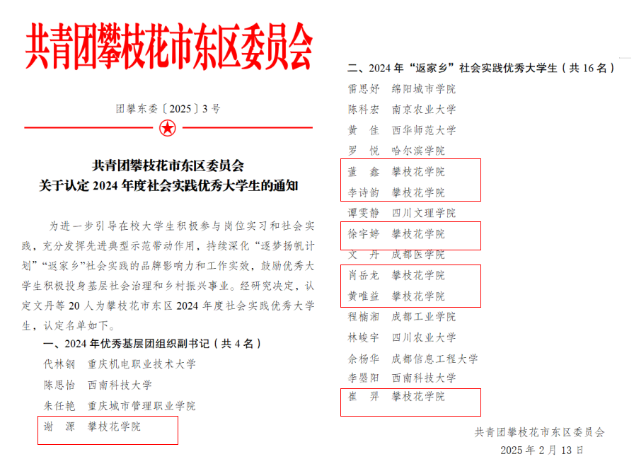 近日,共青团攀枝花市东区委员会发布了《关于认定2024年度社会实践优秀大学生的通知》,我校7名学子荣获我市东区2024年度社会实践优秀大学生荣誉称号。