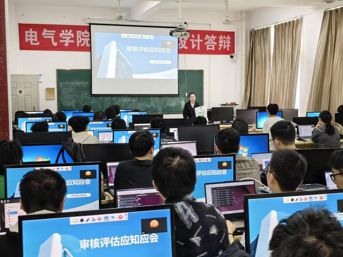 为高质量迎接本科教育教学审核评估,3月12日,电气信息工程学院组织全院22个班级召开“迎评促评”主题班会,确保全院学生以良好状态迎接审核评估。