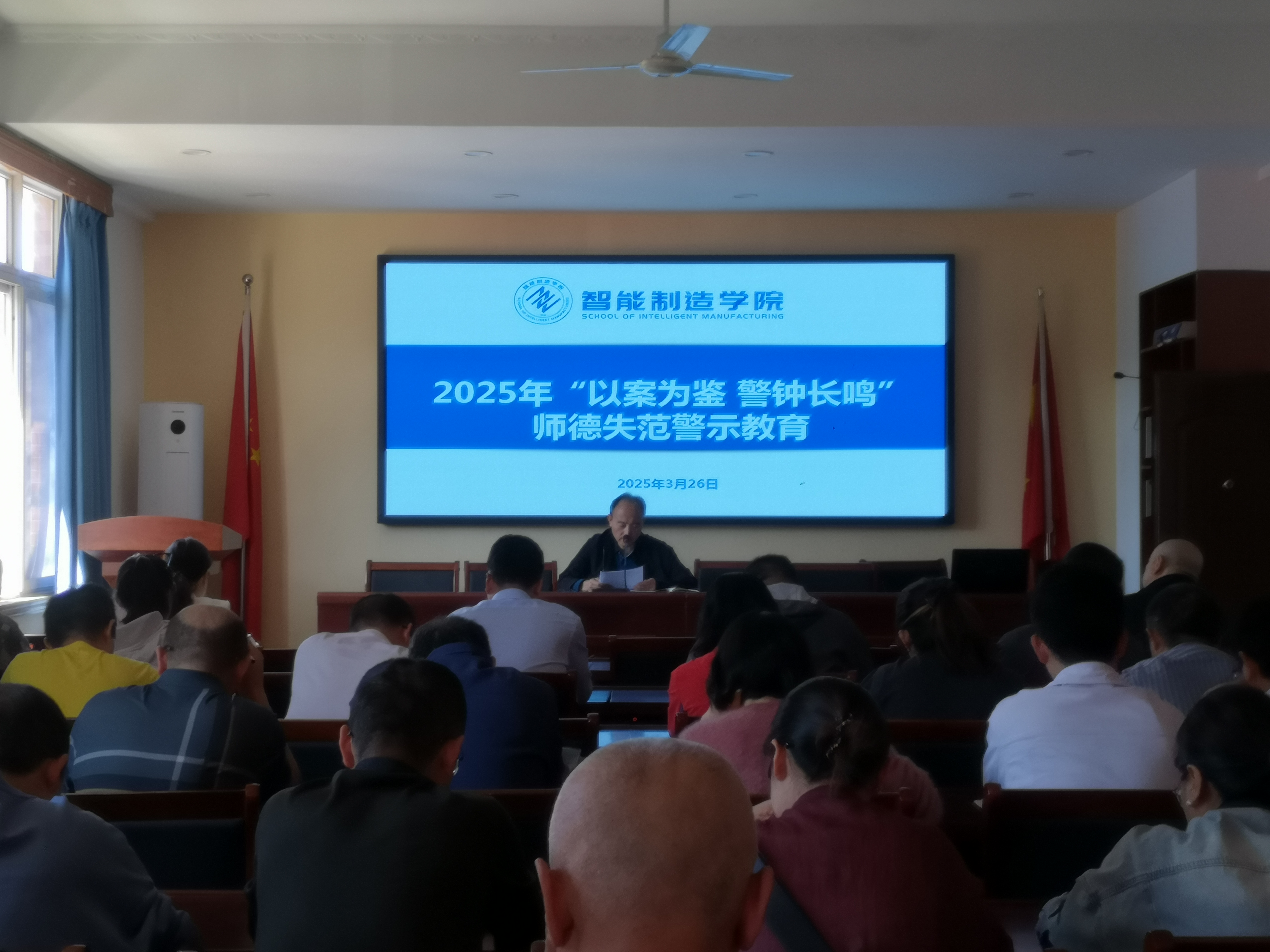 为深入贯彻师德师风是评价教师队伍素质第一标准的理念,强化教育家精神引领,推动全院教职工积极投身应用型一流大学建设,在学校“审核评估年”“基本建设年”“质量提升年”的关键节点,智能制造学院党委积极响应学校《关于开展2025年“以案为鉴 警钟长鸣”师德失范警示教育专题活动的通知》,组织全院教师开展了警示教育专题活动。