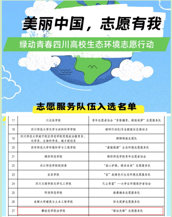 近日,在“美丽中国,志愿有我——绿动青春四川高校生态环境志愿行动”公布的入选名单中,法学院“绿法先锋”志愿者服务队成功入选。