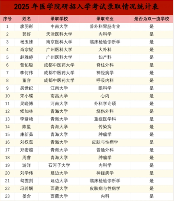 近日,2025年全国硕士研究生招生考试录取结果揭晓,医学院创历史佳绩:本届231名毕业生中,161报考全国硕士研究生考试,124人上线,上线率53.7%;最终85人被成功录取,升学率达36.8%,同比提升11.3个百分点,创学院历史新高。尤为亮眼的是,23人被“双一流”建设高校录取,包括中南大学、哈尔滨医科大学、南京医科大学、天津医科大学等名校,彰显学院"杏林育才高地"的深厚底蕴。