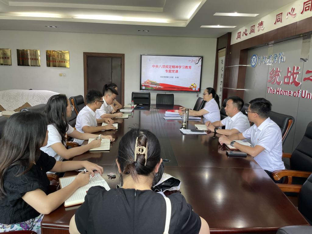 6月18日下午,校党委常委、统战部部长、机关第三党支部书记张勤在弘毅楼402会议室讲授深入贯彻中央八项规定精神学习教育专题党课。党委宣传部、统战部和校团委全体党员参加党课学习。