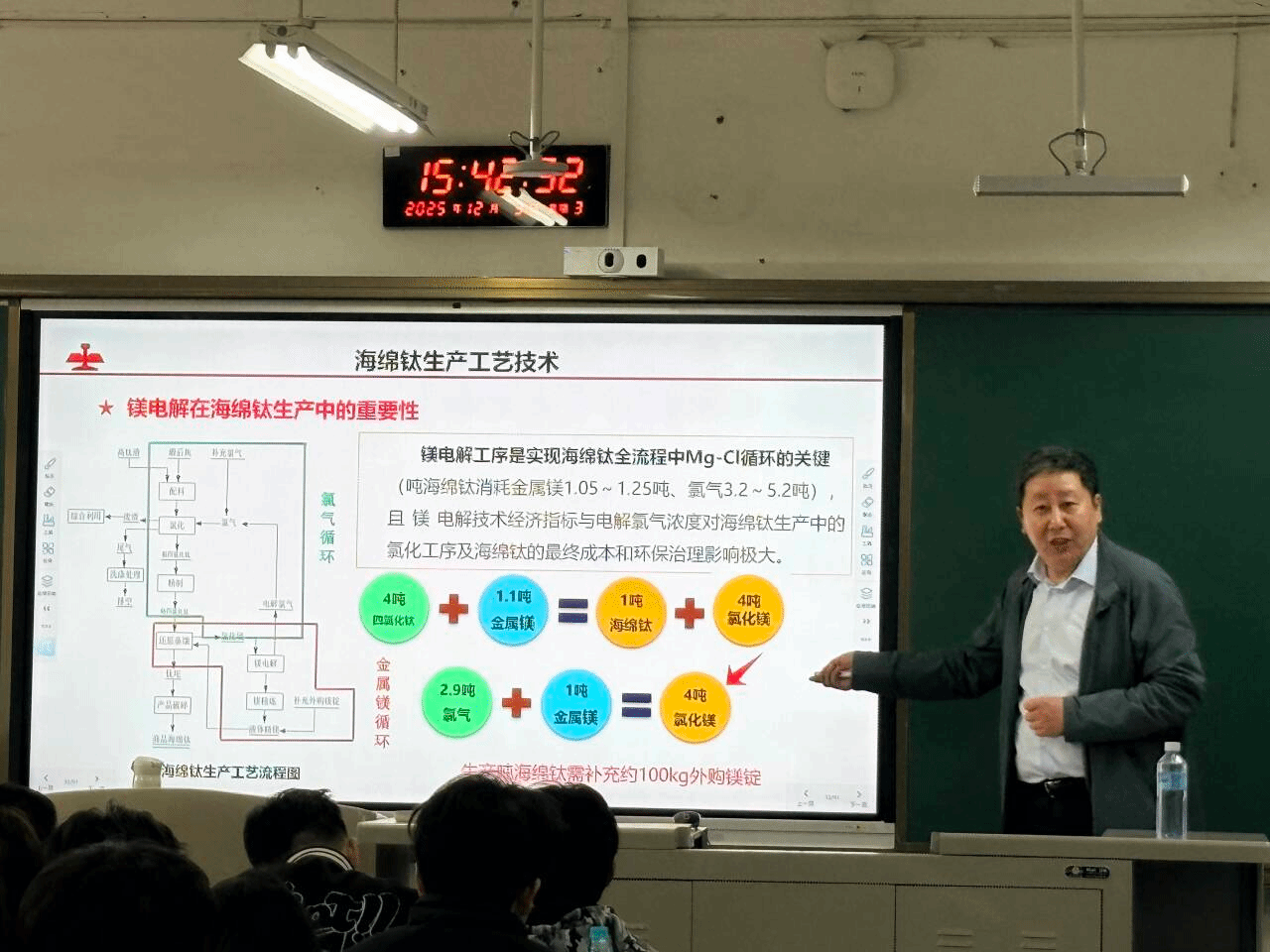 在技术解析环节,姜宝伟重点阐述了当前海绵钛制备的主流工艺——Kroll法,深入剖析了该工艺中镁、氯元素循环利用的核心技术原理,使在场师生对钛金属制备的技术逻辑形成了系统认知。随后,他从钛合金核心性能、海绵钛制备流程、钛合金多元应用三大维度,全面解读了钛金属的独特优势。结合详实案例,姜宝伟专分别阐释了钛合金在航空航天、舰艇潜艇等高端装备制造领域的战略价值,在医用植入、人体修复等医疗健康领域的独特适配性,以及在消费电子、民用器皿等民生领域的广泛应用场景,多维度、全方位展现了钛金属产业的广阔发展前景。