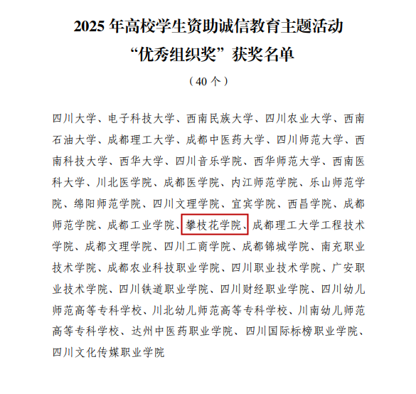 近日,四川省教育厅公布2025年全省高校学生资助诚信教育主题活动评奖结果,我校在“诚信主题宣传作品”与“感恩资助心向党”微视频征集展播中表现突出,共获三等奖1项、优秀奖3项,学校荣获“优秀组织奖”。