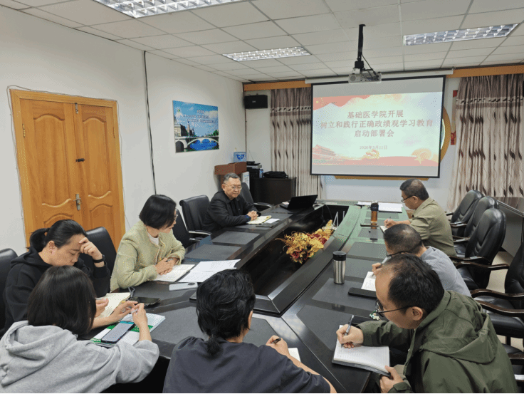 3月11日下午,基础医学院在笃行楼三楼会议室召开树立和践行正确政绩观学习教育启动部署会,传达学习上级相关精神,对学院学习教育工作进行全面安排部署。学院班子成员、党委委员、科室负责人、党支部书记等参加会议,会议由党委副书记、纪委书记任娟主持。