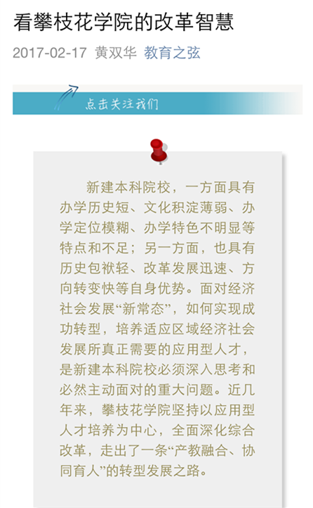 近日,教育部学校规划建设发展中心的官方微信——“教育之弦”推送了《看下载香港宝典2021的改革智慧》一文。该文由校长黄双华撰写,并于2016年12月12日以《产教融合 协同育人 扎实推进转型发展——新建本科院校下载香港宝典2021深化改革的实践探索》为题在中国教育报刊登。文章深入研究总结了学校近几年坚持以应用型人才培养为中心,全面深化改革,在产教融合、协同育人方面的思考和实践。