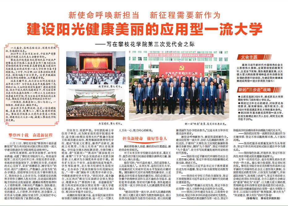 这次大会是在全面建设社会主义现代化国家、向第二个百年奋斗目标进军、加快建设教育强国、科技强国、人才强国的新时代中华民族伟大复兴事业中,也是学校攀登四十载、全力奋进新征程的关键时期,召开的一次十分重要的会议。大会全面回顾了学校第二次党代会以来的工作,总结了学校事业发展取得的成绩、分析了学校发展面临的形势和机遇,擘画了学校未来五年的发展蓝图,引发了与会代表和校内师生热议,川观新闻、中国高校之窗、攀枝花日报、攀枝花新闻联播等各级媒体进行了广泛的报道。